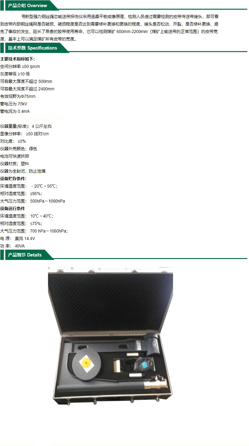·用新型强力钢丝绳芯输送带探伤仪采用液晶平板成像原理,检测人员透过需要检测的皮带传送带接头,即可看到皮带内部钢丝绳网是否破损,破损程度是否达到需要修补更换和更换的程度,接头是否松动,开裂,是否修补更换,避免了事故的发生,延长了昂贵的胶带使用寿命