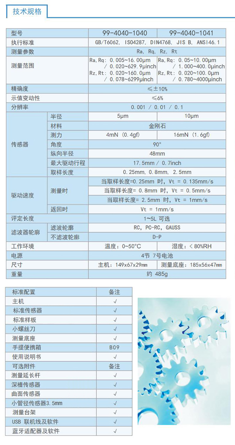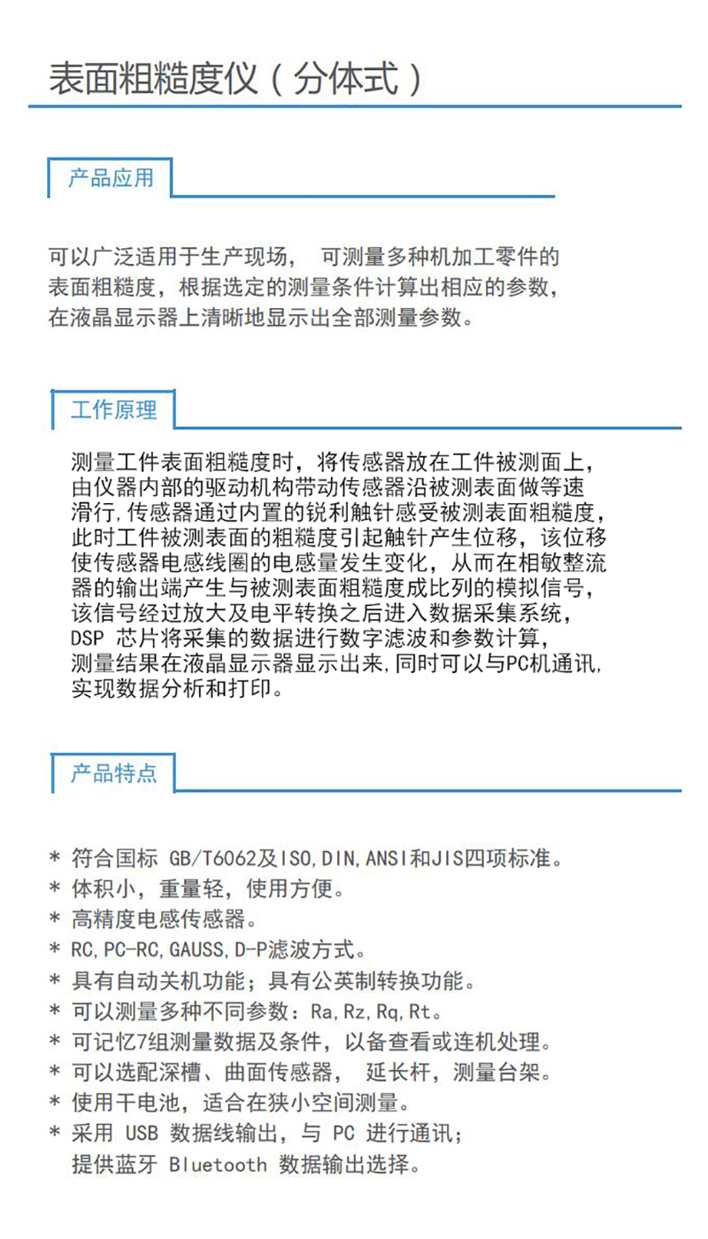 ·体积小,重量轻,使用方便。 ·采用高精度电感传感器。 ·可测量Ra,Rz,Rq,Rt;具有RC,PC-RC,GAUSS,D-P四种滤波方式;可记忆7组测量数据。 ·使用干电池,适合在狭小空间测量。 ·具有自动关机功能;具有公英制转换功能。 ·可以选配深槽、曲面传感器, 延长杆,测量台架。 ·采用 USB 数据线输出,与 PC 进行通讯;提供蓝牙 Bluetooth 数据输出选择。