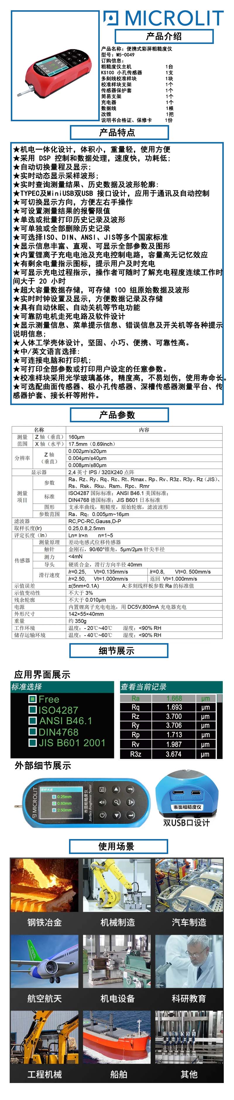 * 机电一体化设计,体积小,重量轻,使用方便 * 采用DSP控制和数据处理,速度快,功耗低: * 自动切换量程及显示; * 实时动态显示采样波形: * 实时查询测量结果、历史数据及波形轮廓; * TYPEC及MiniUSB双USB 接口设计,应用于通讯及自动控制 * 可切换显示方向,方便左右手操作 * 可设置测量结果的报警限值。 * 单选或批量打印历史记录及波形 * 可单独或全部删除历史记录 * 可选择ISO、DIN、ANSI、JIS 等多个国家标准 * 显示信息丰富、直观、可显示全部参数及图形。 * 内置锂离子充电电池及充电控制电路,容量高无记忆效应 * 有剩余电量指示图标,提示用户及时充电 * 可显示充电过程指示,操作者可随时了解充电程度 * 连续工作时间大于20小时 * 超大容量数据存储,可存储100组原始数据及波形* 实时时钟设置及显示,方便数据记录及存储 * 具有自动休眠、自动关机等节电功能 * 可靠防电机走死电路及软件设计 * 显示测量信息、菜单提示信息、错误信息及开关 机等各种提示说明信息; * 人体工学壳体设计,坚固、小巧、便携、可靠性高 * 中/英文语言选择: * 可连接电脑和打印机; * 可打印全部参数或打印用户设定的任意参数。 * 校准样块采用光学玻璃基体,精度高,不易划伤,使用寿命长。 * 可选配曲面传感器、极小孔传感器、深槽传感器测量平台、传感器护套、接长杆等附件。