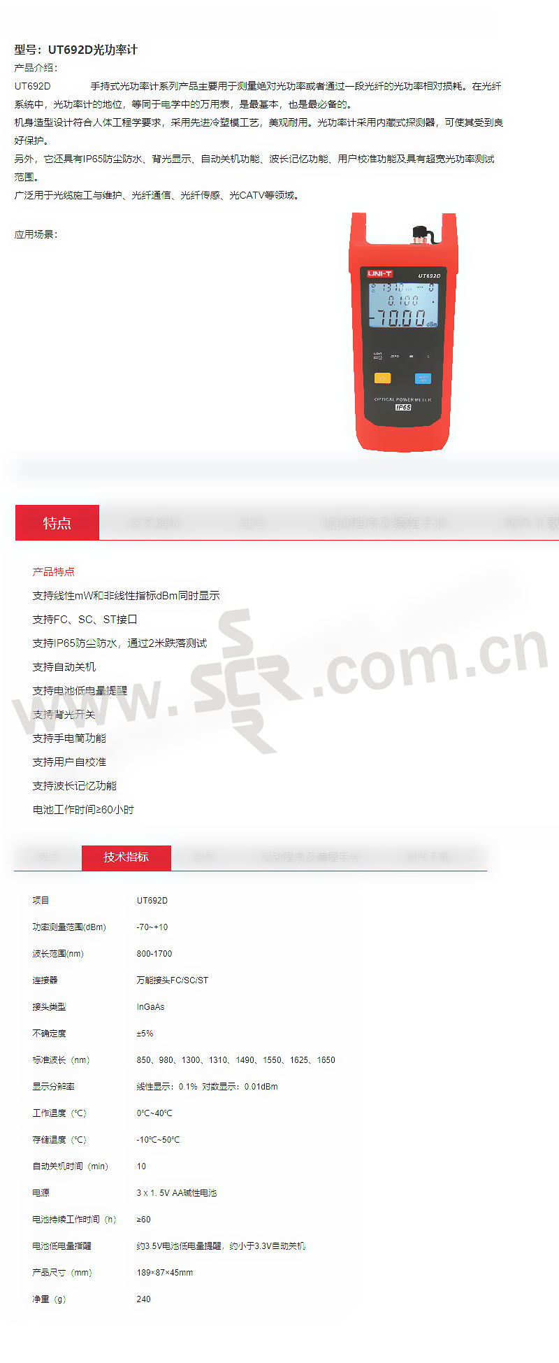 ·支持线性mW和非线性指标dBm同时显示·支持FC、SC、ST接口·支持IP65防尘防水,通过2米跌落测试·支持自动关机·支持电池低电量提醒·支持背光开关·支持手电筒功能·支持用户自校准·支持波长记忆功能·电池工作时间≥60小时