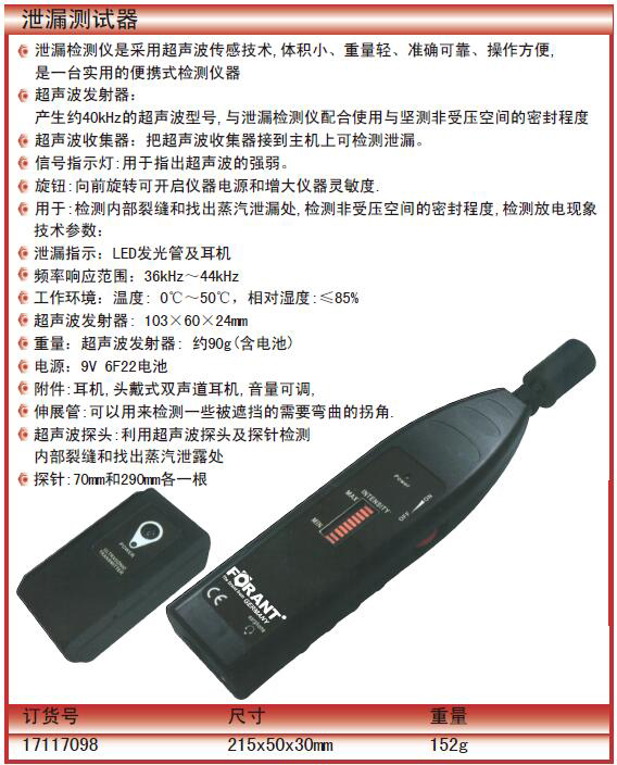 A26138 17117098 36kHz~44kHz 152g 215x50x30mm LED发光管及耳机 0℃~50℃ ≤85% 103×60×24mm 约90g(含电池) 9V 6F22电池 耳机,头戴式双声道耳机,音量可调 可以用来检测一些被遮挡的需要弯曲的拐角. 利用超声波探头及探针检测 内部裂缝和找出蒸汽泄露处 70mm和290mm各一根 2345.00