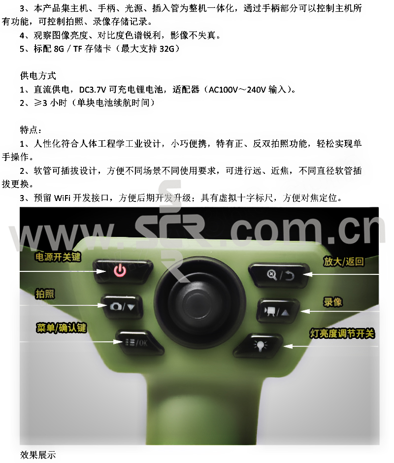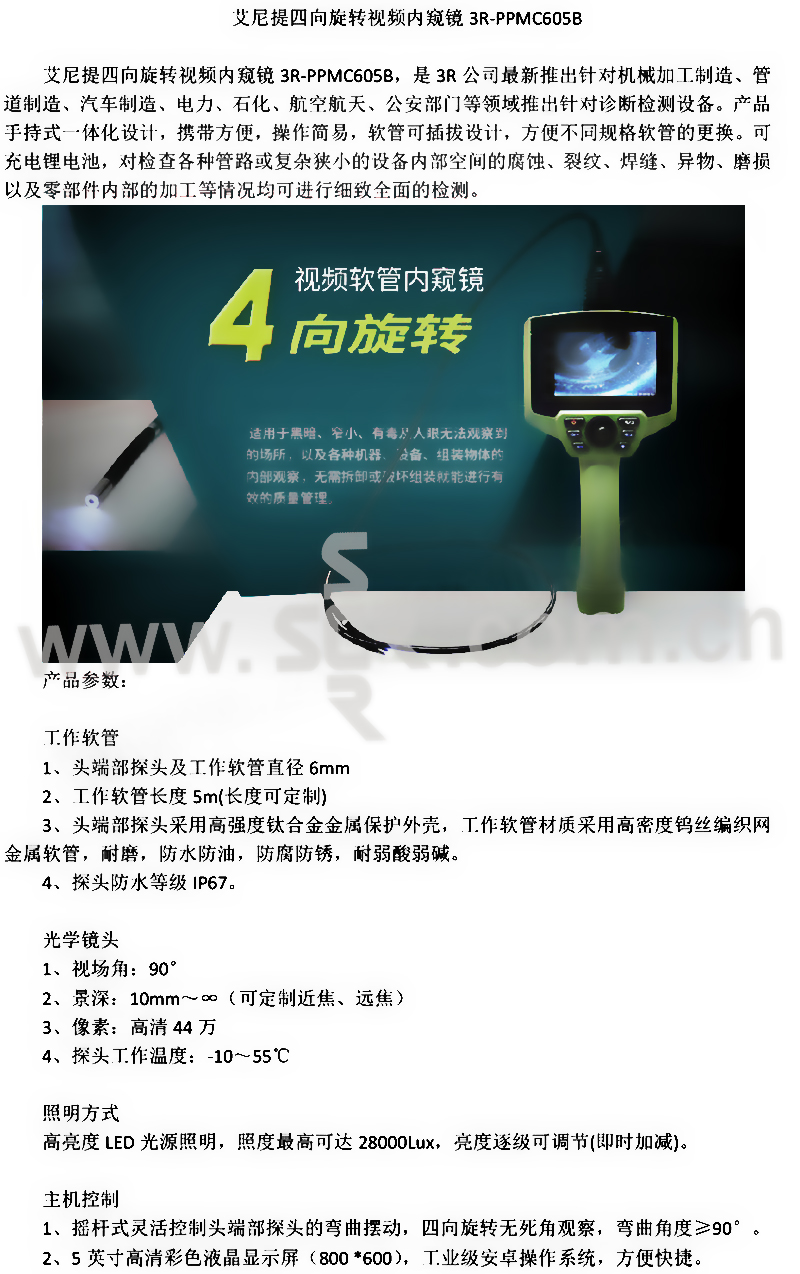 ·艾尼提四向旋转视频内窥镜3R-PPMC605B,是3R公司最新推出针对机械加工制造、管道制造、汽车制造、电力、石化、航空航天、公安部门等领域推出针对诊断检测设备。产品手持式一体化设计,携带方便,操作简易,软管可插拔设计,方便不同规格软管的更换。可充电锂电池,对检查各种管路或复杂狭小的设备内部空间的腐蚀、裂纹、焊缝、异物、磨损以及零部件内部的加工等情况均可进行细致全面的检测。