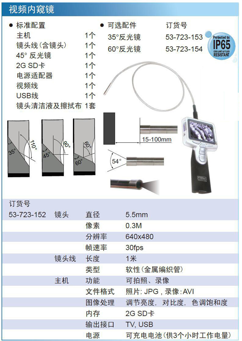 ·标准配置主机 1个;镜头线含镜头 1个;45° 反光镜 1个;2G SD卡 1个;电源适配器 1个;视频线 1个;USB线 1个;镜头清洁液及擦拭布 1套 ·可选配件 订货号35°反光镜 53-723-153 60°反光镜 53-723-154