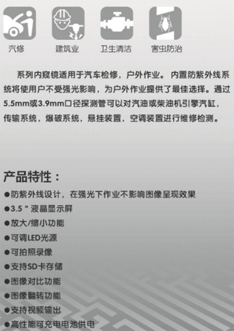 ·自适应图像处理功能,应对不同大小空间与抛光情况; ·360度全方位转向系统、无延时; ·模块化的可更换设计,主机可一键分离,可同时支持多种管线系统;