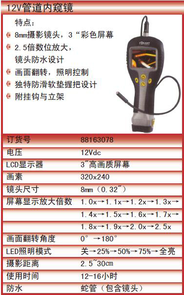 ·8mm摄影镜头,3“彩色屏幕 ·2.5倍数位放大, ·镜头防水设计 ·内置4GB记忆卡, ·可USB传输电脑 ·画面翻转,照明控制 ·独特防滑软垫握把设计 ·附挂钩与立架