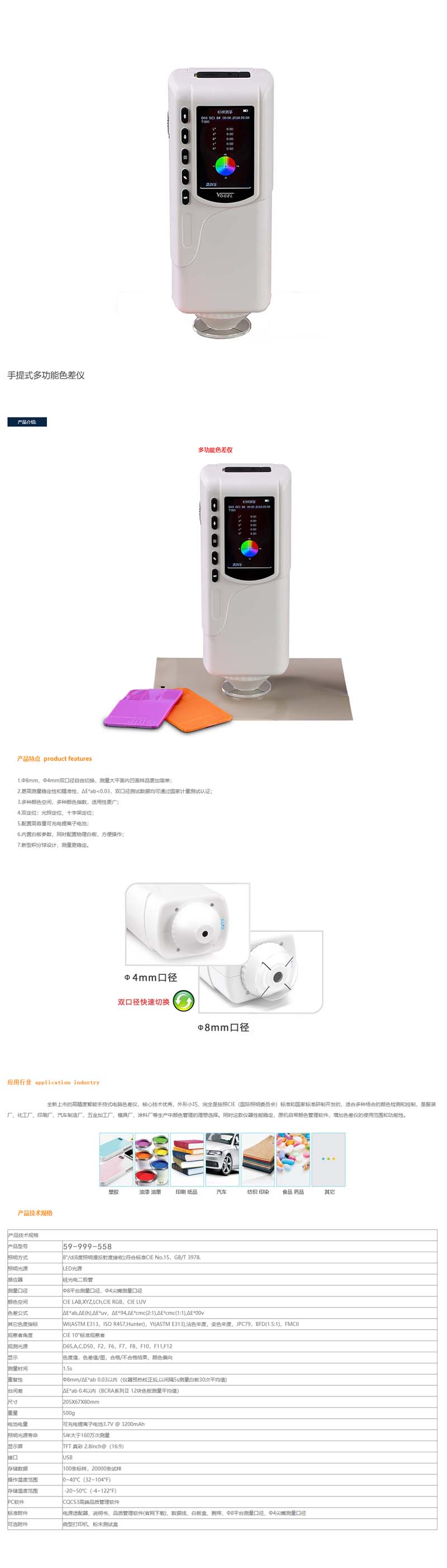 ·φ8mm、φ4mm双口径自由切换,测量大平面内凹面样品更加简单; ·更高测量稳定性和精准性; ·多种颜色空间,多种颜色指数,适用性更广; ·配置高容量可充电锂离子电池