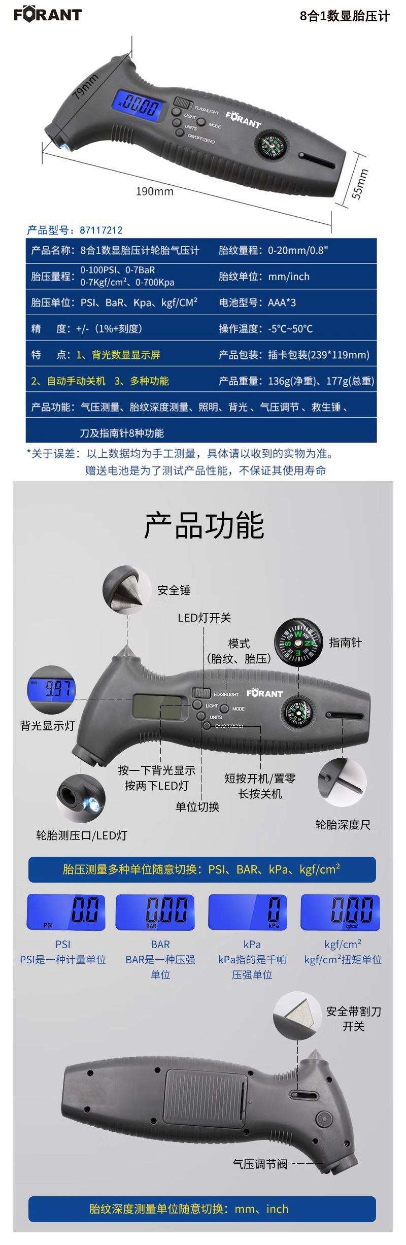 产品特征: ·胎纹深度测量范围是0-20mm/0.8” ·具有气压测量、胎纹深度测量、照明、LED 背光、气压调节、救生锤、刀以及指南针8种功能
