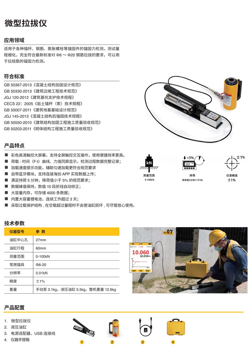 ·彩色高清触控大屏幕,支持全屏触控交互操作,使用便捷效率更高。 ·荷载-时间(F-t)曲线、力值同屏显示,检测过程数据完整记录; ·加载速度提示功能,辅助匀速加载更符合规范要求 ·自带蓝牙模块,支持连接海创APP实现数据上传; ·满足持荷5分钟,降荷值小于5%的规范要求; ·数据峰值保持,数值10段折线自动修正; ·大容量内存,可存储4000条数据; ·内置大容量锂电池,连续工作超过3天; 产品配置 1.微型手动泵 2.液压油缸 3.转换头 4.拉杆 5.锚具 6.电源适配器、USB连接线 7.仪器银箱 I扫码回复“V10S” f播放HC-V10S微型拉拔仪 [功能演示视频 ·釆取过载保护结构,在空载超过量程时不会使油缸损坏,可尽管放心使用。