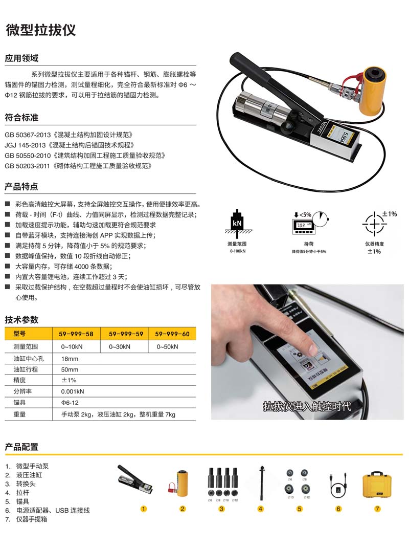 ·彩色高清触控大屏幕,支持全屏触控交互操作,使用便捷效率更高。 ·荷载-时间(F-t)曲线、力值同屏显示,检测过程数据完整记录; ·加载速度提示功能,辅助匀速加载更符合规范要求 ·自带蓝牙模块,支持连接海创APP实现数据上传; ·满足持荷5分钟,降荷值小于5%的规范要求; ·数据峰值保持,数值10段折线自动修正; ·大容量内存,可存储4000条数据; ·内置大容量锂电池,连续工作超过3天; ·釆取过载保护结构,在空载超过量程时不会使油缸损坏,可尽管放 心使用。
