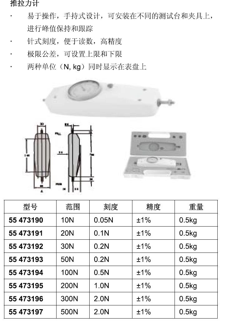 ·易于操作,手持式设计,可安装在不同的测试台和夹具上, ·进行峰值保持和跟踪 ·针式刻度,便于读数,高精度 ·极限公差,可设置上限和下限: ·两种单位(N, kg)同时显示在表盘上
