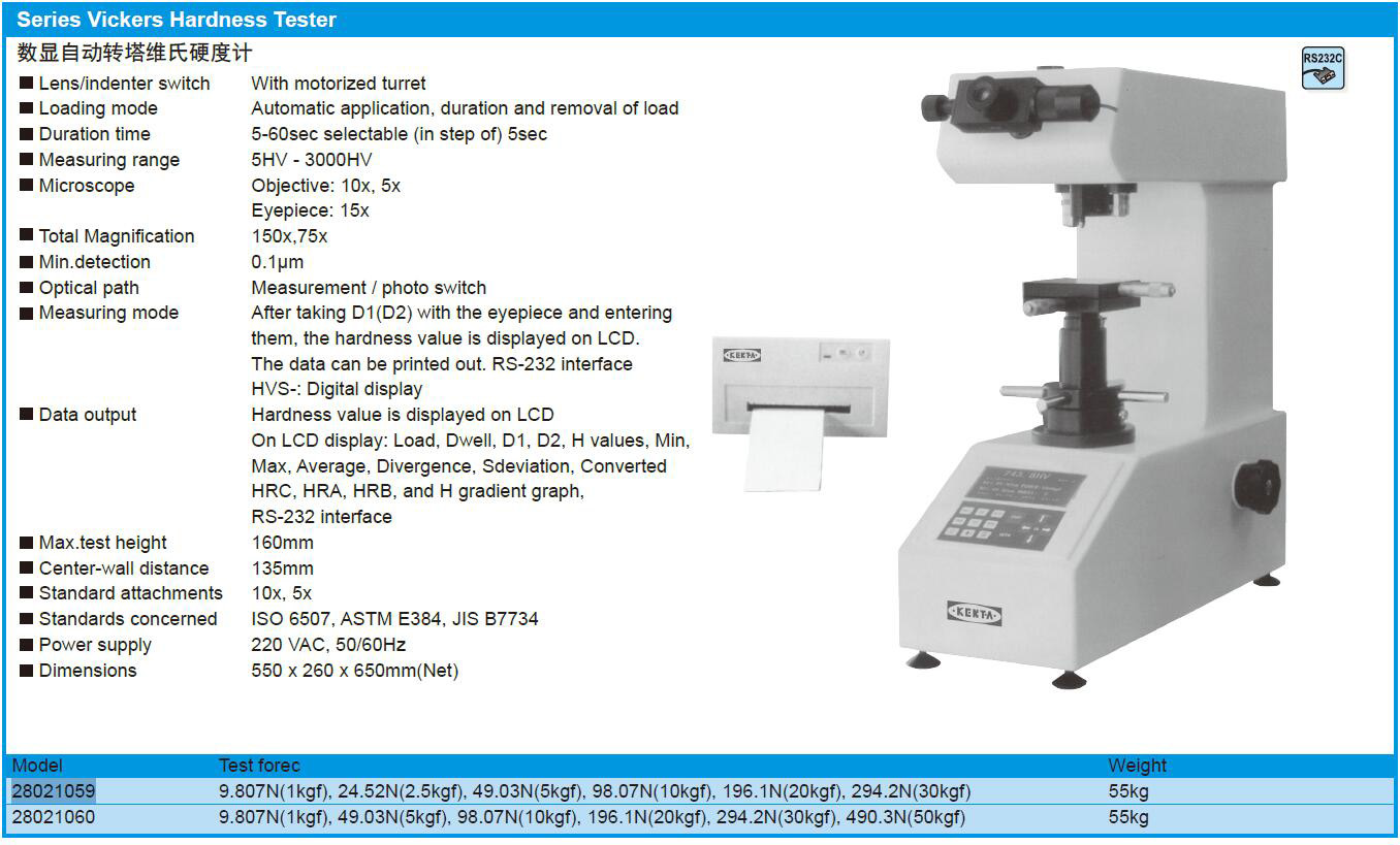 数显自动转塔维氏硬度计 028021060 550×260×650mm 1台