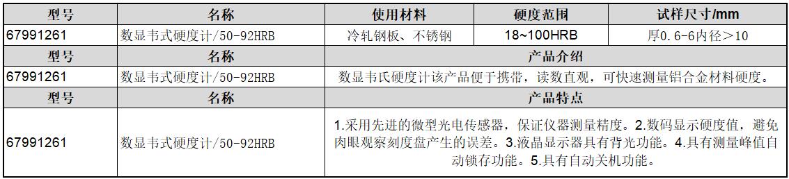·采用先进的微型光电传感器,保证仪器测量精度。 ·数码显示硬度值,避免肉眼观察刻度盘产生的误差。 ·液晶显示器具有背光功能。 ·具有测量峰值自动锁存功能。 ·具有自动关机功能。 ·数显韦氏硬度计该产品便于携带,读数直观,可快速测量铝合金材料硬度。