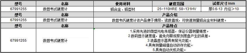·采用先进的微型光电传感器,保证仪器测量精度。 ·数码显示硬度值,避免肉眼观察刻度盘产生的误差。 ·液晶显示器具有背光功能。 ·具有测量峰值自动锁存功能。 ·具有自动关机功能。 ·数显韦氏硬度计该产品便于携带,读数直观,可快速测量铝合金材料硬度。