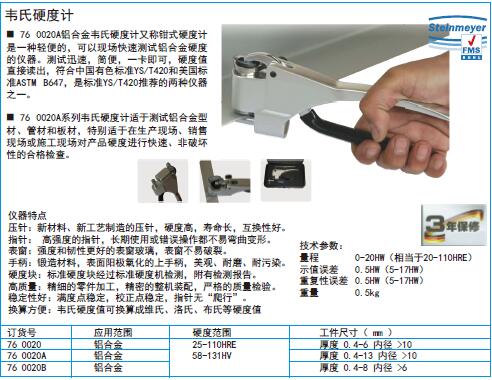 ·760020A铝合金韦氏硬度计又称钳式硬度计是一种轻便的,可以现场快速测试铝合金硬度的仪器。测试迅速,简便,一卡即可,硬度值直接读出,符合中国有色标准YS/T420和美国标准ASTMB647,是标准YS/T420推荐的两种仪器之一。 ·760020A系列韦氏硬度计适于测试铝合金型材、管材和板材,特别适于在生产现场、销售现场或施工现场对产品硬度进行快速、非破坏性的合格检查。仪器特点 ·压针:新材料、新工艺制造的压针,硬度高,寿命长,互换性好。指针:高强度的指针,长期使用或错误操作都不易弯曲变形。表窗:强度和韧性更好的表窗玻璃,表窗不易破裂。 ·手柄:锻造材料,表面阳极氧化的上手柄,美观、耐磨、耐污染。硬度块:标准硬度块经过标准硬度机检测,附有检测报告。 ·高质量:精细的零件加工,精密的整机装配,严格的质量检验。稳定性好:满度点稳定,校正点稳定,指针无“爬行”。 ·换算方便:韦氏硬度值可换算成维氏、洛氏、布氏等硬度值