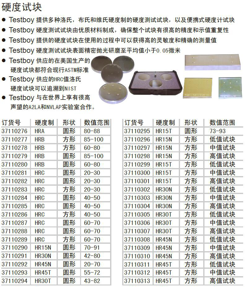 ·Testboy 提供多种洛氏,布氏和维氏硬度制的硬度测试试块,以及便携式硬度计试块