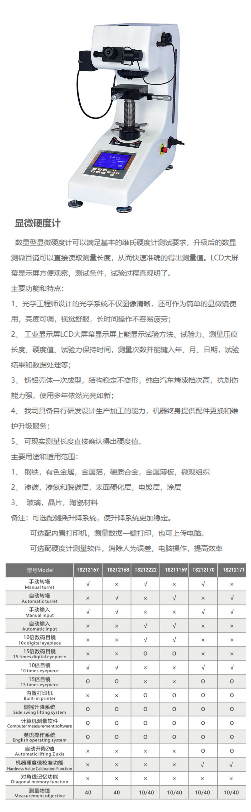 ·采用LCD显示屏,可切换硬度标尺HV或HK ·试验过程自动化,操作简便 ·高倍率光学测量系统和光学双通道结构,光源亮度可以20级调节 ·硬度换算功能 ·角线长度D1和D2值编码器输入,减少人为读数误差 ·测量结果可打印机输出 ·物镜与压头可自动切换,定位更准确