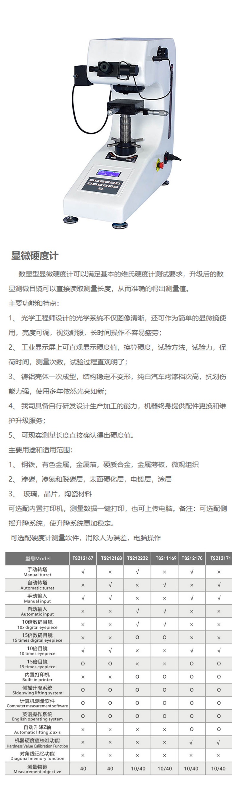 ·采用LCD显示屏,可切换硬度标尺HV或HK ·试验过程自动化,操作简便 ·高倍率光学测量系统和光学双通道结构,光源亮度可以20级调节 ·硬度换算功能 ·角线长度D1和D2值编码器输入,减少人为读数误差 ·测量结果可打印机输出 ·物镜与压头可自动切换,定位更准确