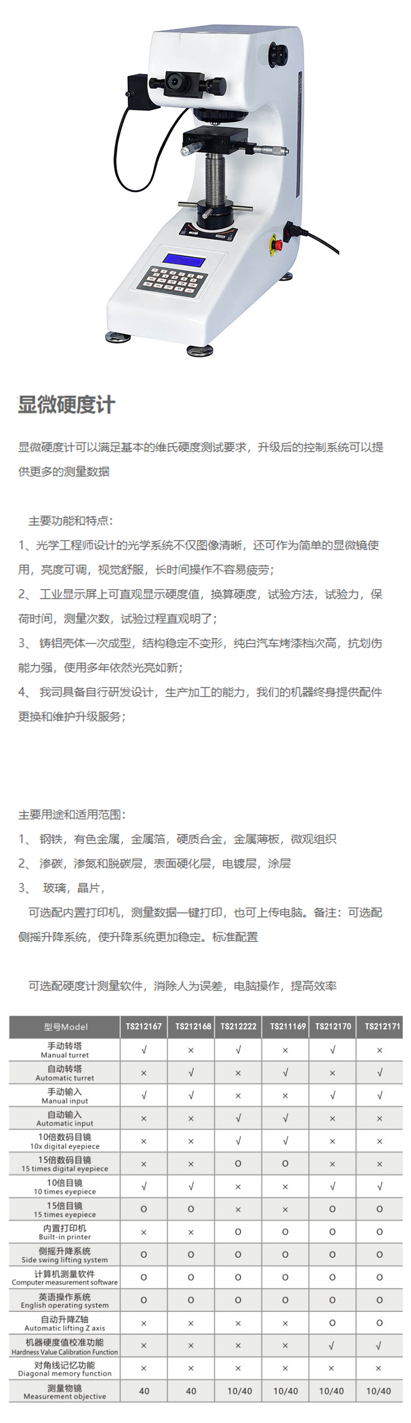 ·采用LCD显示屏,可切换硬度标尺HV或HK ·试验过程自动化,操作简便 ·高倍率光学测量系统和光学双通道结构,光源亮度可以20级调节 ·硬度换算功能 ·角线长度D1和D2值编码器输入,减少人为读数误差 ·测量结果可打印机输出 ·物镜与压头可自动切换,定位更准确