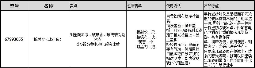 ·手持式折射仪是是根期不同浓度的液体具有不同的折射率这一原理设计而成的。 ·是一种用于测量防冻液冰点,铅酸蓄电池电解液比重的精密光学仪器,具有操作筒单,携带方便,使用便捷,测量液少、准确迅速等特点。 ·只要滴几滴液体在棱镜上,然后向着光观察,就可以快速读出溶液测量值,广泛应用于化工、汽车等行业中 ·测量防冻液、玻璃水、玻璃清洗剂冰点 ·以及铅酸蓄电池电解液比重 ·折射仪一只 ·接镜布一块 ·滴管一个 ·螺丝刀一把 ·用柔软绒布擦净棱镜表面及盖板,掀开盖板,取2~3滴被测溶液滴于折光棱镜上,盖上盖板 轻轻按压平,里面不要有气泡,然后通过目镜读取白分界线的相对刻度,即为被测液体的测量值。