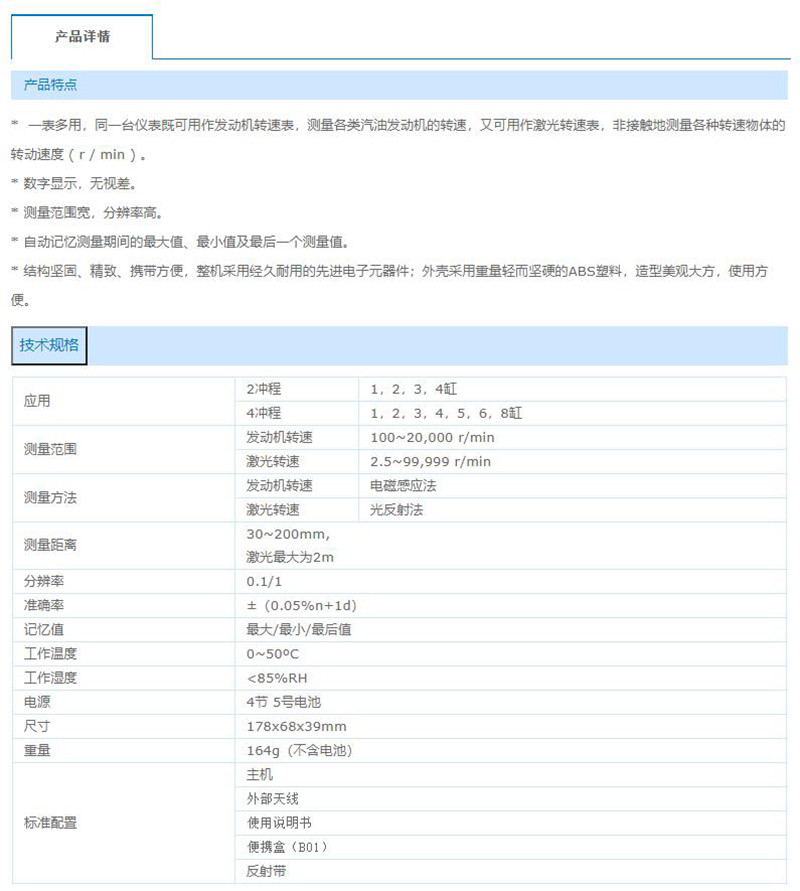 ·发动机转速表是一种非接触式转速表, ·非接触式检测可以方便、安全地进行测量。 ·它保证了准确的测量,带有信号捕获指示 ·测量范围广,分辨率高。