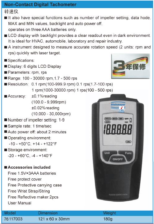 ·还具有特殊功能,例如叶轮设置数量,数据指针,MAX和MIN值,背光和自动关闭电源,仅可使用三节AAA电池。 ·带有背光的LCD显示屏即使在黑暗环境中也能提供清晰的读数。 ·是暖通空调,汽车,实验室和维修行业的理想选择。 ·设计用于测量准确转速的仪器(2个单位:rpm和rps)快速对准激光目标。ps)快速对准激光目标。 ·规格: ·1显示:6位液晶显示 ·参数:rpm,rps ·1范围:100-300o0rpm,1.7-500rps ·l分辨率:0.1rpm(100-999.9rpm)0.1rps(1.7-100rps) ·1rpm(10oo-300o0rpm)1rps(100-5o0rps) ·精度:土0.1%读数(100.0-9,999rpm)土0.02%读数(10,000-30,0oorpm)awotb5t ·叶轮设置数:1-9 ·采样率;1秒 ·自动关闭电源:约2分钟 ·操作环境:-10-+50°C,+14-+122°F ·储存环境:统一-20-+60°C,-4-+140°F ·随附配件 ·免费提供1.5V×3AAA电池 ·免费保护套 ·免费腕带StraprString ·免费反光机:2个 ·用户手册