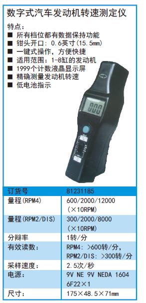 ·所有档位都有数据保持功能钳头开口:0.6英寸(15.5mm) ·一键式操作,方便快捷 ·适用范围:1-8缸的发动机1999个计数液晶显示屏精确测量发动机转速低电池指示