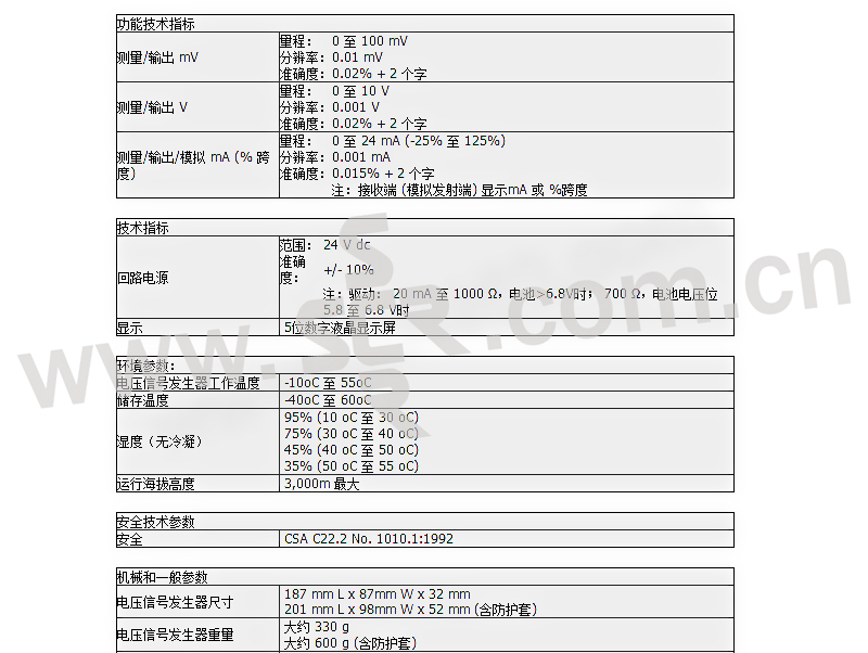 ·测量/输出(mV)量程:0至100mV,分辨率:0.01mV,准确度:0.02%+2个字·测量/输出(V)量程:0至10V,分辨率:0.001V,准确度:0.02%+2个字·测量/输出模拟mA(%跨度)量程:0至24mA(-25%至125%),分辨率:0.001mA,准确度:0.015%+2个字·回路电源:24Vdc,准确度:±10% ·显示:5位数字液晶显示屏