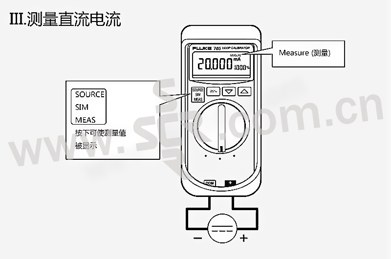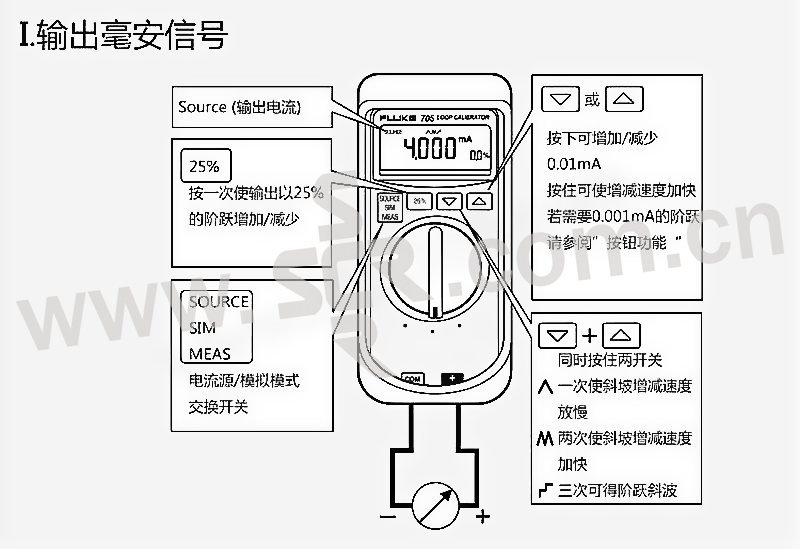 ·大显示屏,简单按钮界面,使用方便环路校准器同时显示 mA 和百分比读数,可快速、简便地读取测量结果·0.02% 的mA 准确度·按下按钮时,以25%的步长进行快速、简便的线性度检查。比传统的旋钮节省大量时间。·"跨度检查"功能,可快速检查零点和跨度·环路校准器可选慢速、快速斜坡、步进功能,提供连续平滑输出以测试环路和阀滑动。·24 V的内置回路电源,可给变送器供电,并测量其输出,不用携带数字多用表。·更换方便的单节 9V 电池