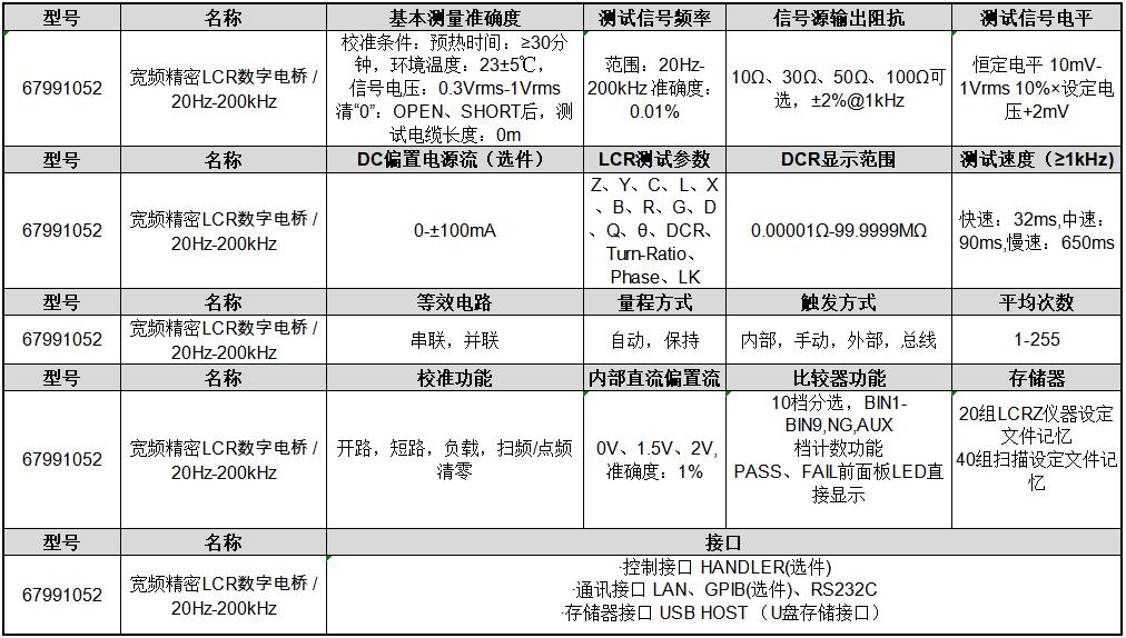 ·校准条件:预热时间:≥30分钟,环境温度:23±5℃, ·信号电压:0.3Vrms-1Vrms ·清“0”:OPEN、SHORT后,测试电缆长度:0m ·10档分选,BIN1-BIN9,NG,AUX ·档计数功能 ·PASS、FAIL前面板LED直接显示 ·控制接口 HANDLER(选件) ·通讯接口 LAN、GPIB(选件)、RS232C ·存储器接口 USB HOST (U盘存储接口)