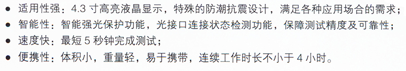 ·适用性强:4.3寸高亮液晶显示,特殊的防潮抗震设计,满足各种应用场合的需求; ·智能性:智能强光保护功能,光接口连接状态检测功能,保障测试精度及可靠性; ·速度快:最短5秒钟完成测试; ·便携性:体积小,重量轻,易于携带,连续工作时长不小于4小时。
