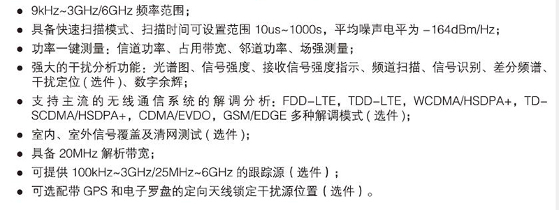 ·9kHz~3GHz/6GHz频率范围; ·具备快速扫描模式、扫描时间可设置范围10us~1000s,平均噪声电平为-164dBm/Hz; ·功率―键测量:信道功率、占用带宽、邻道功率、场强测量; ·强大的干扰分析功能:光谱图、信号强度、接收信号强度指示、频道扫描、信号识别、差分频谱、干扰定位(选件)、数字余辉; ·支持主流的无线通信系统的解调分析:FDD-LTE,TDD-LTE,WCDMA/HSDPA+,TD-SCDMA/HSDPA+,CDMA/EVDO,GSM/EDGE多种解调模式(选件); ·室内、