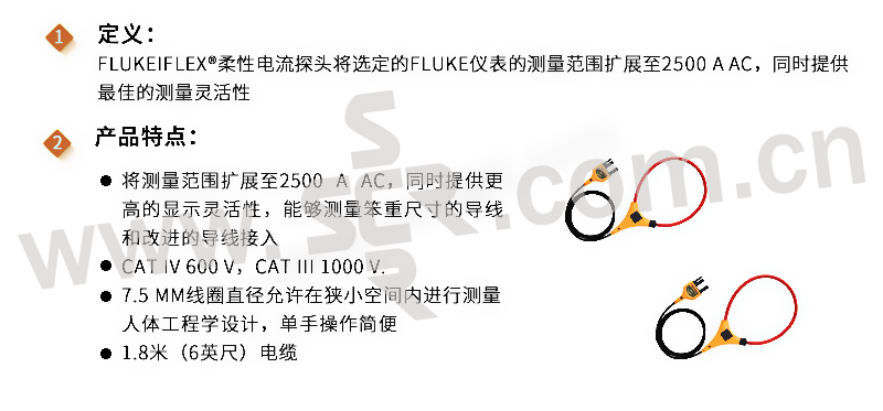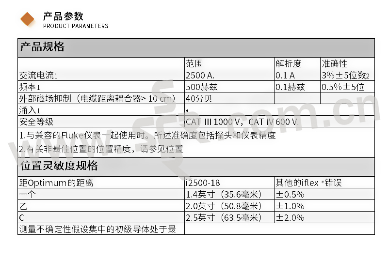 ·将测量范围扩大到2500 A AC,同时提供更高的显示灵活性、测量尺寸不合适的导线的能力和改进的导线接入。·IV类600 V,III类1000 V·7.5 mm线圈直径允许在狭窄空间内测量·人体工程学设计,单手操作方便·1.8米(6英尺)电缆·三年保修
