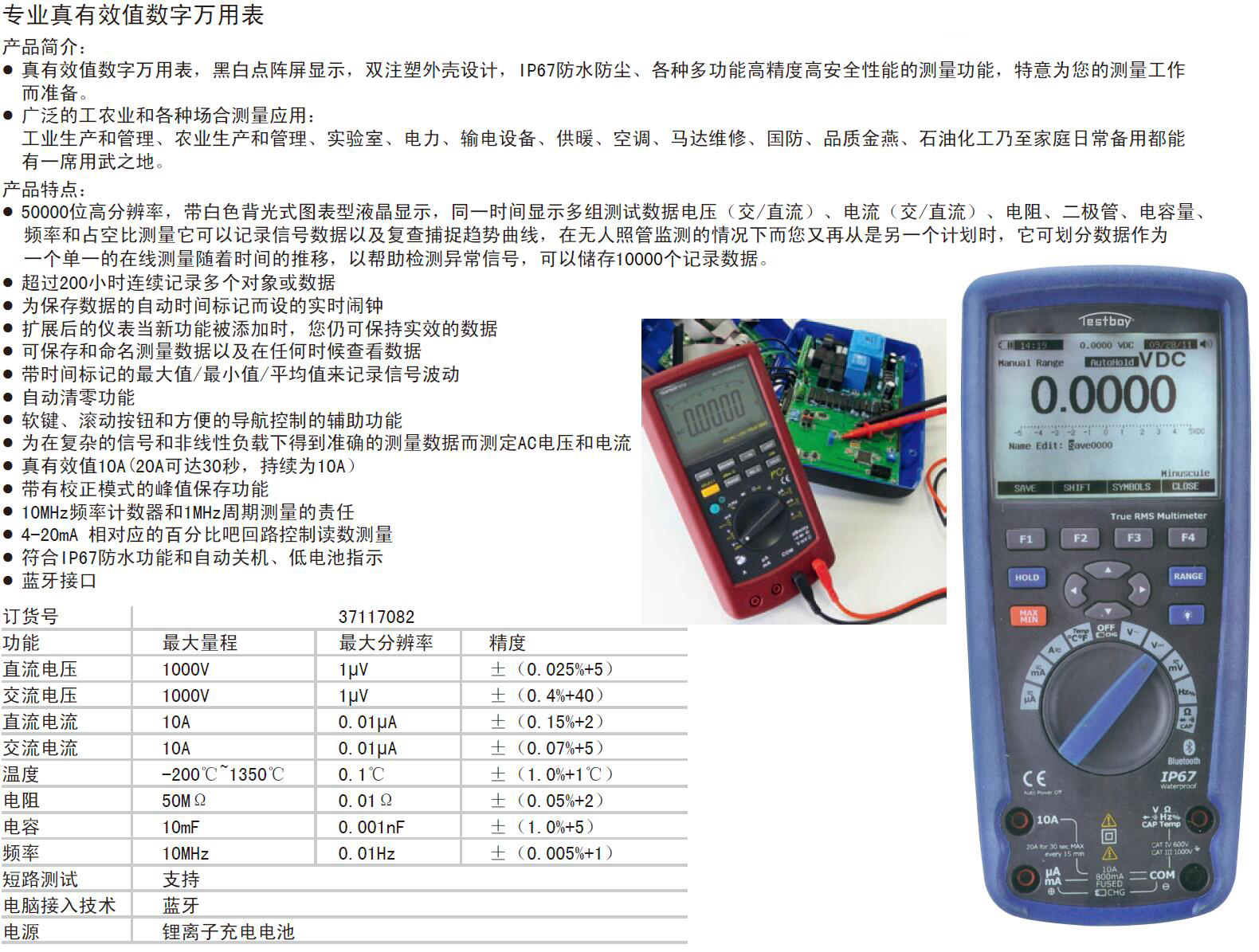 ·50000位高分辨率,带白色背光式图表型液晶显示,同一时间显示多组测试数据电压(交/直流)、电流(交/直流)、电阻、二极管、电容量、频率和占空比测量它可以记录信号数据以及复查捕捉趋势曲线,在无人照管监测的情况下而您又再从是一个计划时,它可划分数据作为一个单一的在线测量随着时间的推移,以帮助检测异常信号,可以储存10000个记录数据。 · 超过200小时连续记录多个对象或数据 ·为保存数据的自动时间标记而设的实时闹钟 ·扩展后的仪表当新功能被添加时,您仍可保持实效的数据 ·可保存和命名测量数据以及在任何时候查看数据 ·带时间标记的最大值/最小值/平均值来记录信号波动 ·自动清零功能 ·软键、滚动按钮和方便的导航控制的辅助功能 ·为在复杂的信号和非线性负载下得到准确的测量数据而测定AC电压和电流真有效值10A(20A可达30秒,持续为10A) ·带有校正模式的峰值保存功能 ·10MHz频率计数器和1MHz周期测量的责任 ·4-20mA 相对应的百分比吧回路控制读数测量 ·符合IP67防水功能和自动关机、低电池指示 ·蓝牙接口