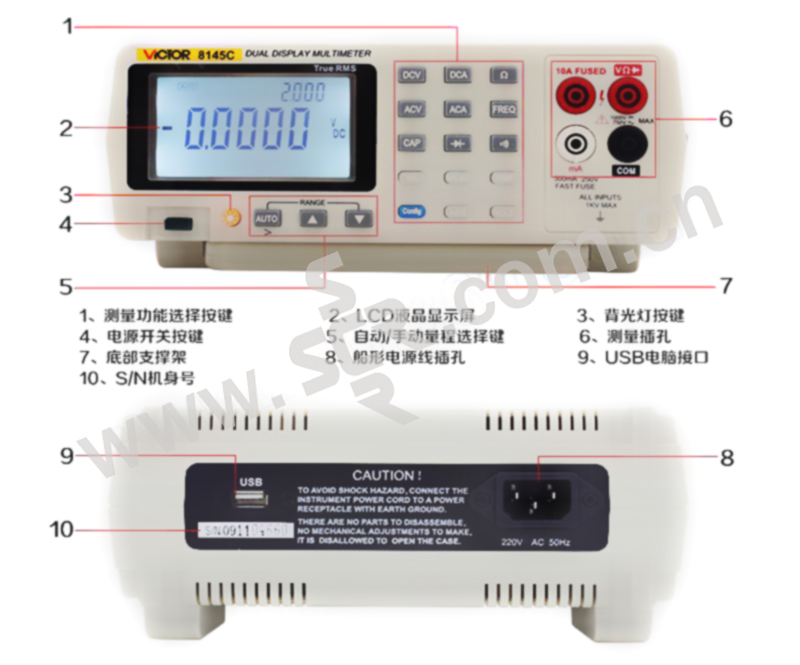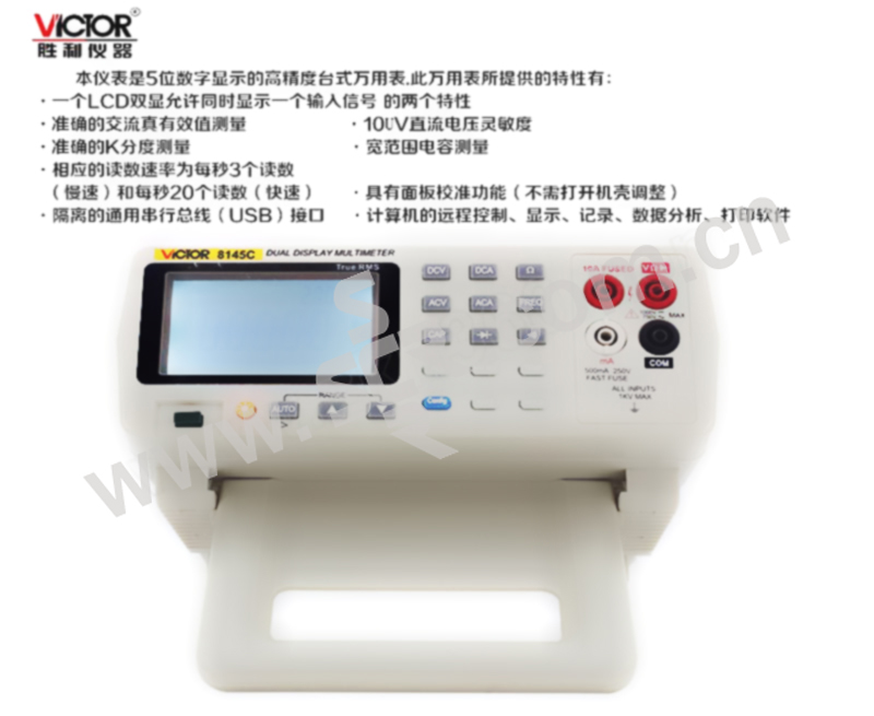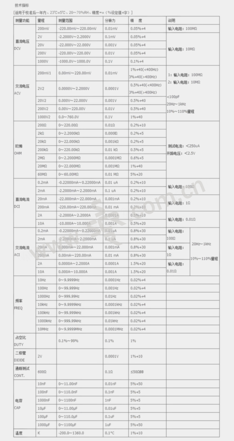 ·4-1/2位分辨率,显示读数值22000字,直流电压准确度达0.05%。 · 测量功能直流电压、交流电压、直流电流、交流电流、电阻、电容测量、频率测量、通断、二极管测试、温度测量、最大值、最小值、平均值测量(MAX/MIN/AVG)、相对值测量(REL_%) ·直流、电阻测量,快速:20次/秒,慢速:2.5次/秒。 ·交流测量,快速:24次/秒,慢速:3次/秒。 ·交流真有效值测量,测量带宽:20Hz~1KHz。 ·可选择手动或自动量程测量,测量值显示保