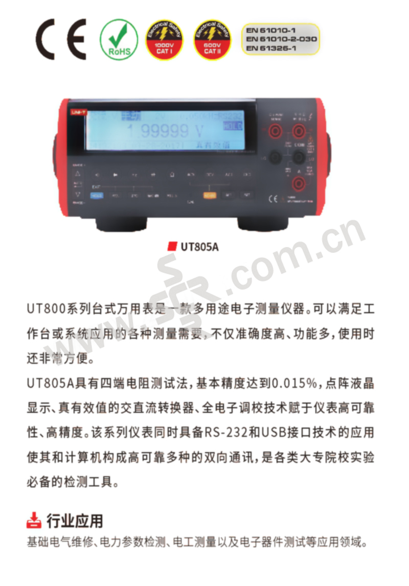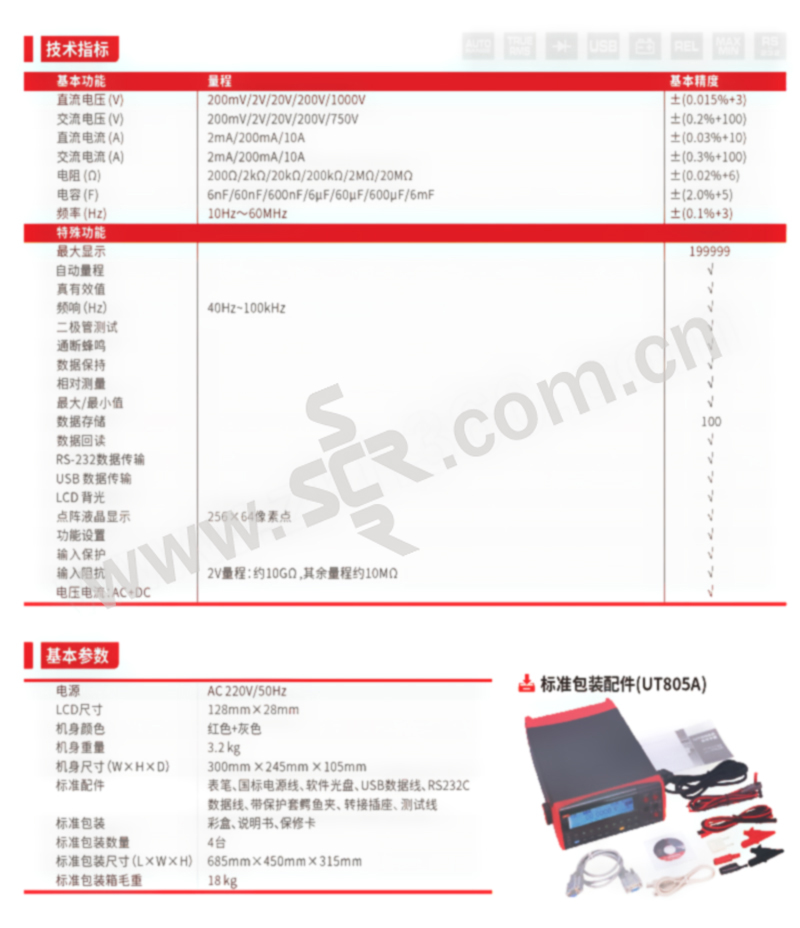·具有交流电压/电流真有效值测量·晶体管测量功能,配有插件原件多功能测试插座·数据保持功能,方便保持测量结果,随时读取·配有K型热电偶测温功能·AC+DC功能,可测量带有直流偏置的交流电压或电流·高达100KHz频率响应·具备RS232C和USB标准接口实时传输数据与PC通讯·四端电阻测试法,基本精度达0.015%·点阵液晶显示·提供电池、市电二种供电方式