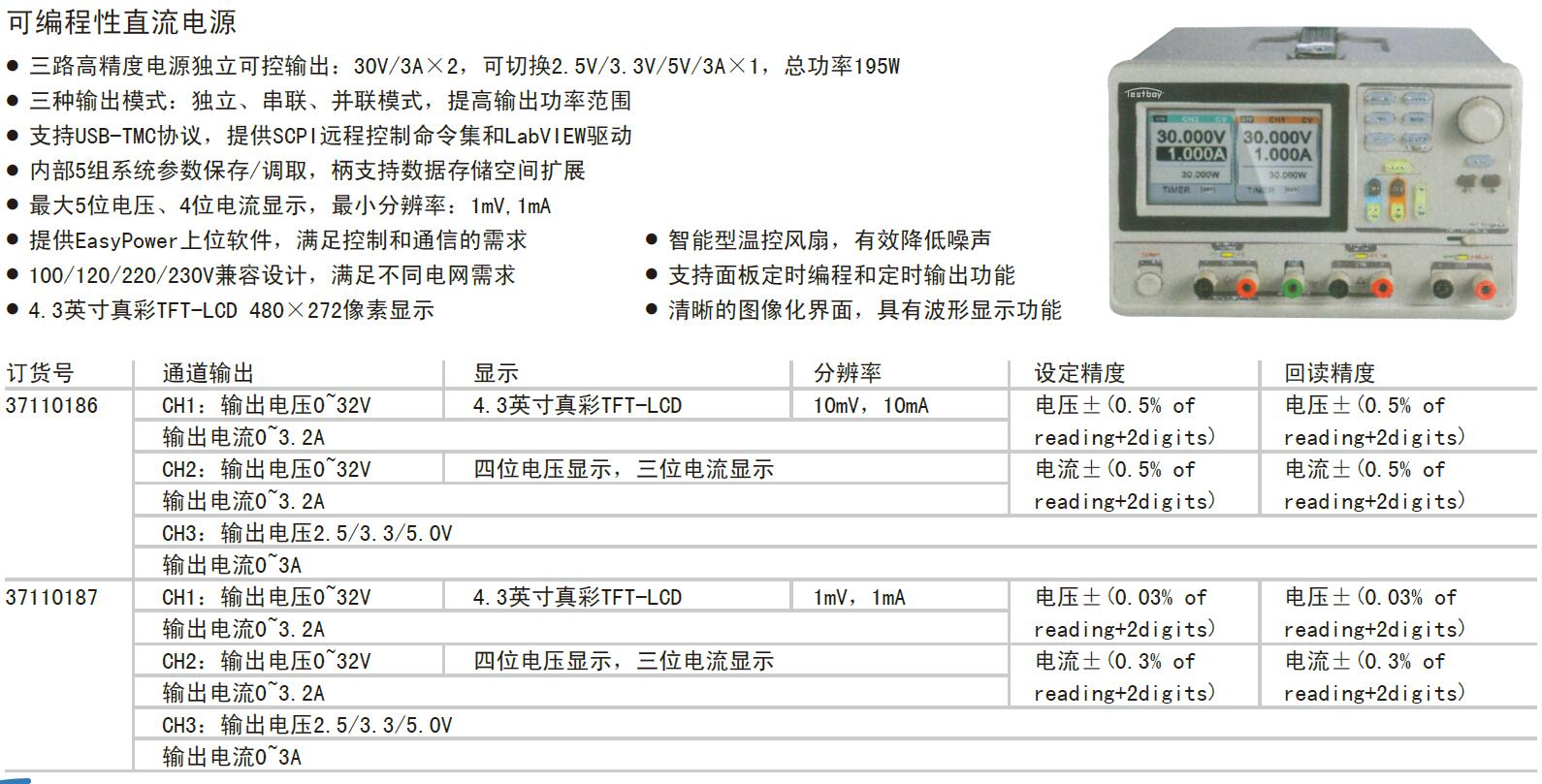 可编程性直流电源 ·三路高精度电源独立可控输出:30V/3A×2,可切换2.5V/3.3V/5V/3A×1,总功率195W ·三种输出模式:独立、串联、并联模式,提高输出功率范围 ·支持USB-TMC协议,提供SCPI远程控制命令集和LabVIEW驱动 ·内部5组系统参数保存/调取,柄支持数据存储空间扩展 ·最大5位电压、4位电流显示,最小分辨率:1mV,1mA ·提供EasyPower上位软件,满足控制和通信的需求 ·智能型温控风扇,有效降低噪声 ·100/120/220/230V兼容设计,满足不同电网需求 ·支持面板定时编程和定时输出功能 ·4.3英寸真彩TFT-LCD 480×272像素显示 ·清晰的图像化界面,具有波形显示功能
