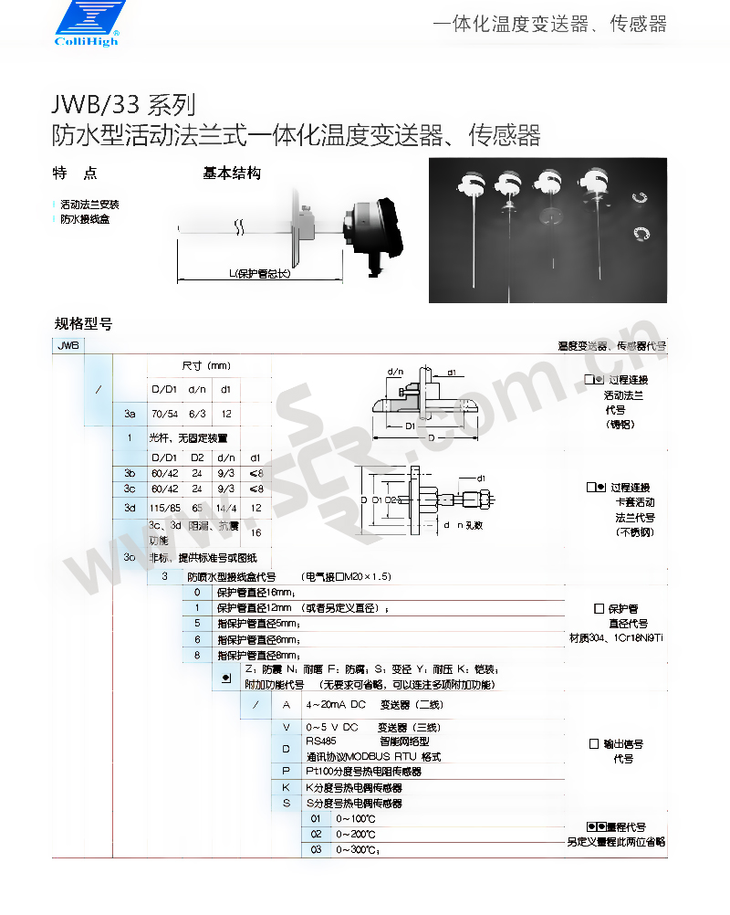 KLHAIAN/昆仑海岸 温度变送器 JWB/33 0~200℃ 0~10V φ8mm 光杆总长L=350mm 标准铝合金活动法兰 1台