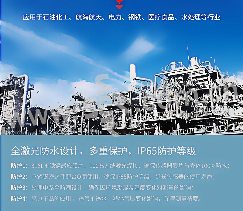·进口扩散硅或陶瓷芯体,适用不同的介质的压力液位测量·激光调阻温度补偿,使用温域宽,测量准确度高·过压过流反向级性电路保护,可靠性高·电压、电流、网络、HART,无线等多种输出方式·可以带LCD、LED、指针等各种现场显示·符合工业抗干扰EMC国标三级