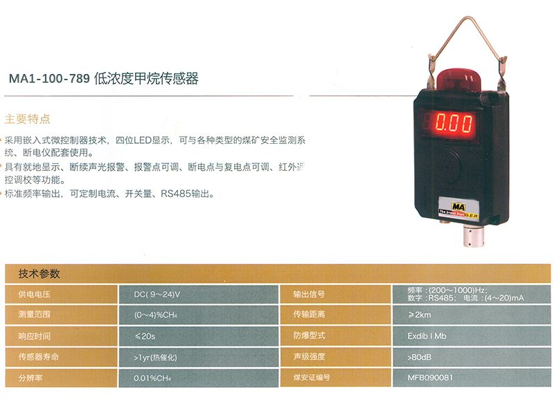 ·采用嵌入式微控制器技术,四位LED显示,可与各种类型的煤矿安全监测系统、断电仪配套使用。 具有就地显示、断续声光报警、报警点可调、断电点与复电点可调、红外遥控调校等功能。 ·标准频率输出,可定制电流、开关量、RS485输出。