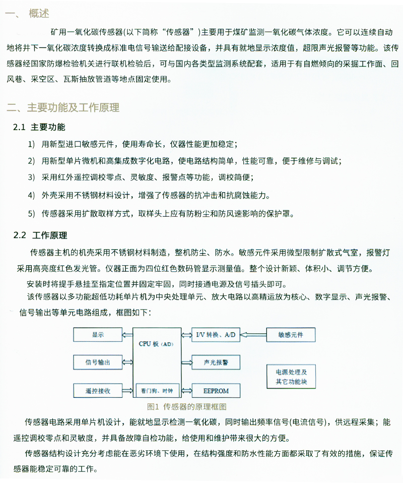 ·用新型进口敏件,使用寿命长,仪器性能更加稳定; ·用新型单片微机和高集成数字化电路,使电路结构简单,性能可靠,便于维修与调试; ·采用红外遥控调校零点、灵敏度、报警点等功能,调校简便; ·外壳采用不锈钢材料设计,增强了传感器的抗冲击和抗腐蚀能力。 ·传感器采用扩散取样方式,取样头上应有防粉尘和防风速影响的保护罩。