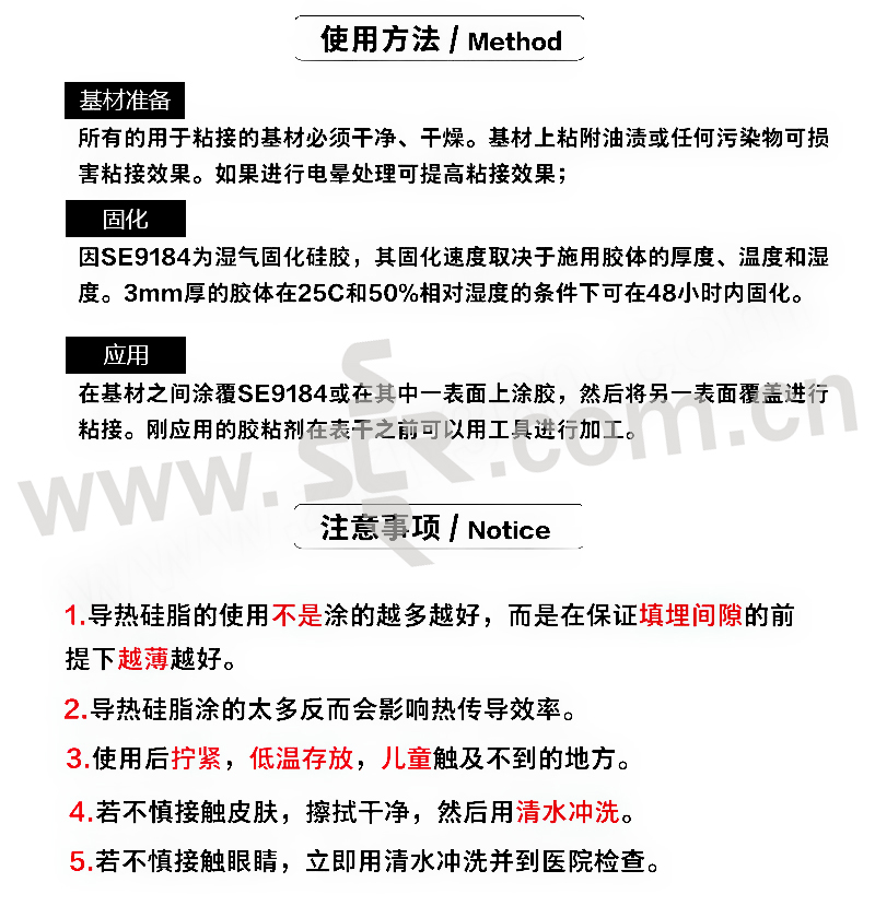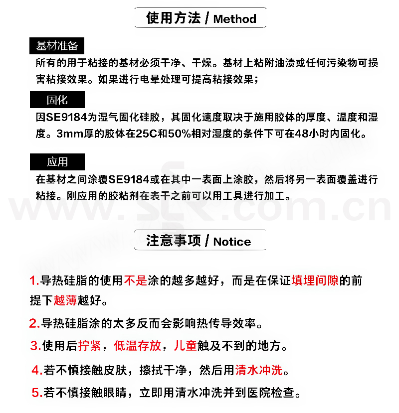 ·高导热性:具有高导热性能,适用于需要导热粘接的场合。·脱醇型:固化反应的副产物为醇类,对基材无腐蚀。·快速表干:提高生产效率。·通用性强:对大多数基材都有良好的粘接效果。·精炼型:通过小分子精炼使本品可用于精密元器件上,不会对元器件造成腐蚀。·阻燃性能:通过UL94-V0阻燃认证。