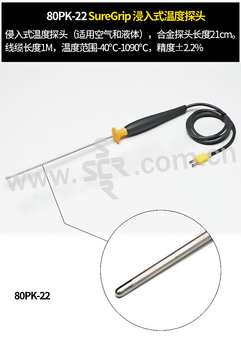 ·Fluke80PK-22SureGrip浸入式温度探头·80PK-22SureGrip浸入式温度探头,适用于液体和凝胶,也可以用作通用温度探头。该热电偶结点从探尖到手柄均采用因康镍合金护套。80PK-22可与任何支持K型热电偶并采用微型连接器输入的测温仪配合使用。