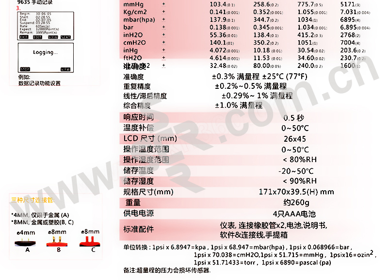 AZ/衡欣 压力记录仪 AZ96315 ±15psi 1台