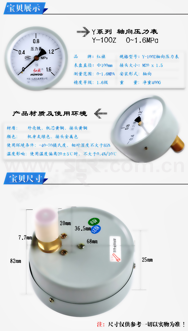 HONGQI/红旗 轴向压力表 Y-100Z 0~40MPa 1只