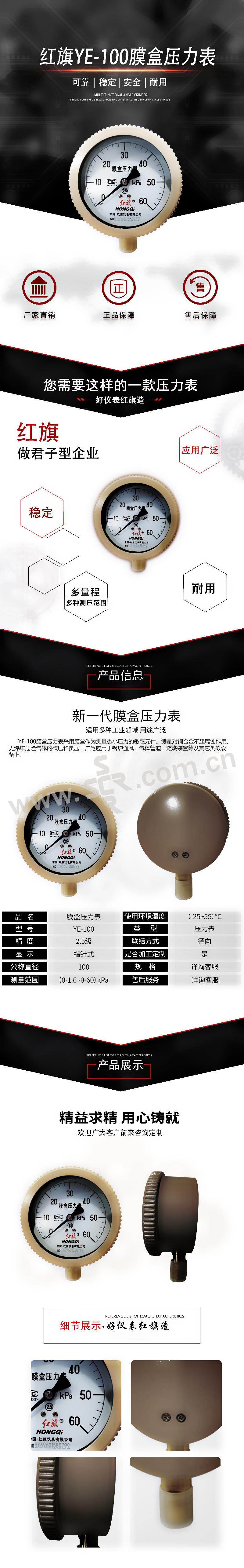 HONGQI/红旗 膜盒压力表 YE-100 0~100kPa 1个