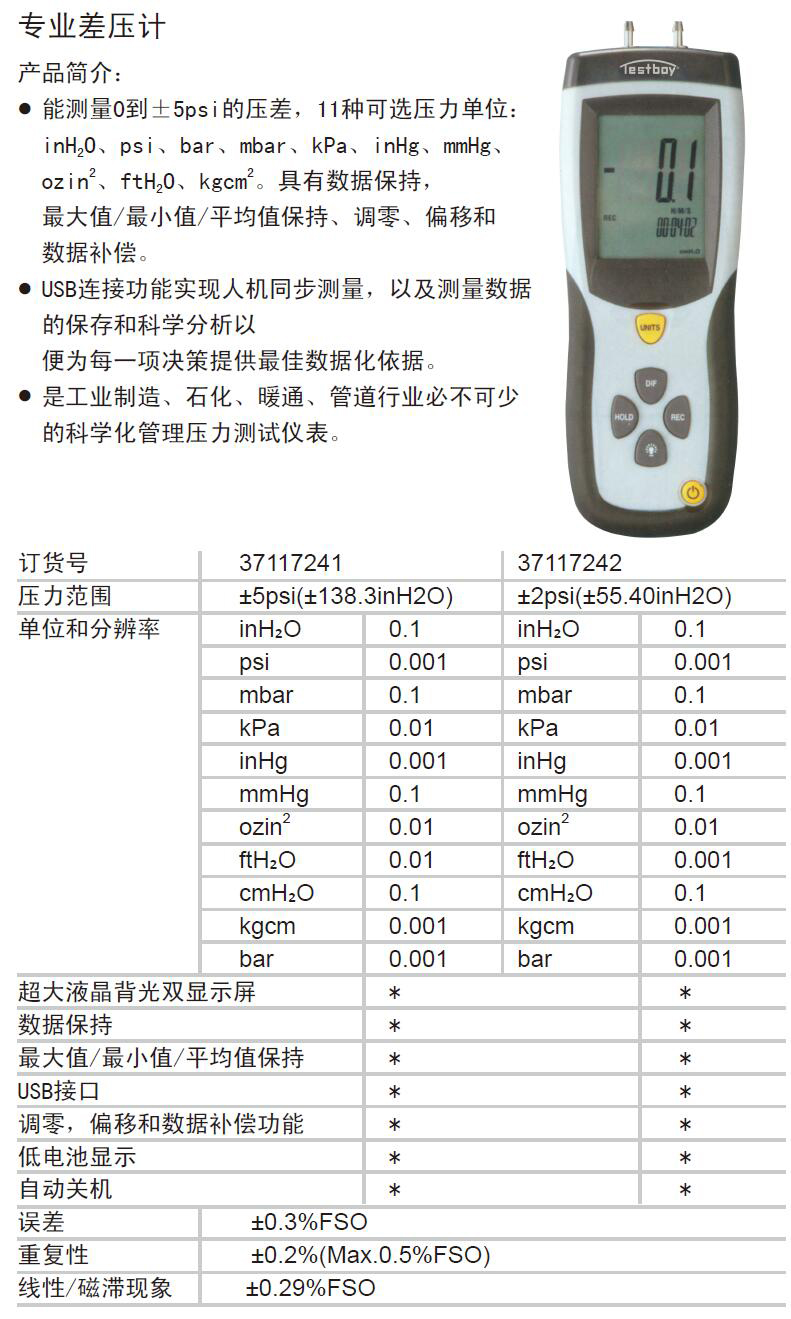 ·产品简介: · 能测量0到±5psi的压差,11种可选压力单位: inH2O、psi、bar、mbar、kPa、inHg、mmHg、 ozin2、ftH2O、kgcm2。具有数据保持, 最大值/最小值/平均值保持、调零、偏移和 数据补偿。 · USB连接功能实现人机同步测量,以及测量数据 的保存和科学分析以 便为每一项决策提供最佳数据化依据。 · 是工业制造、石化、暖通、管道行业必不可少 的科学化管理压力测试仪表。