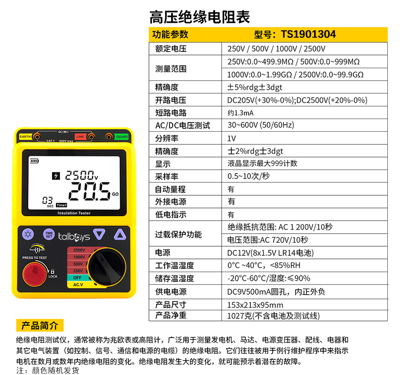 规格:  250V / 500V / 1000V / 2500V 制造商型号:  TS1901304