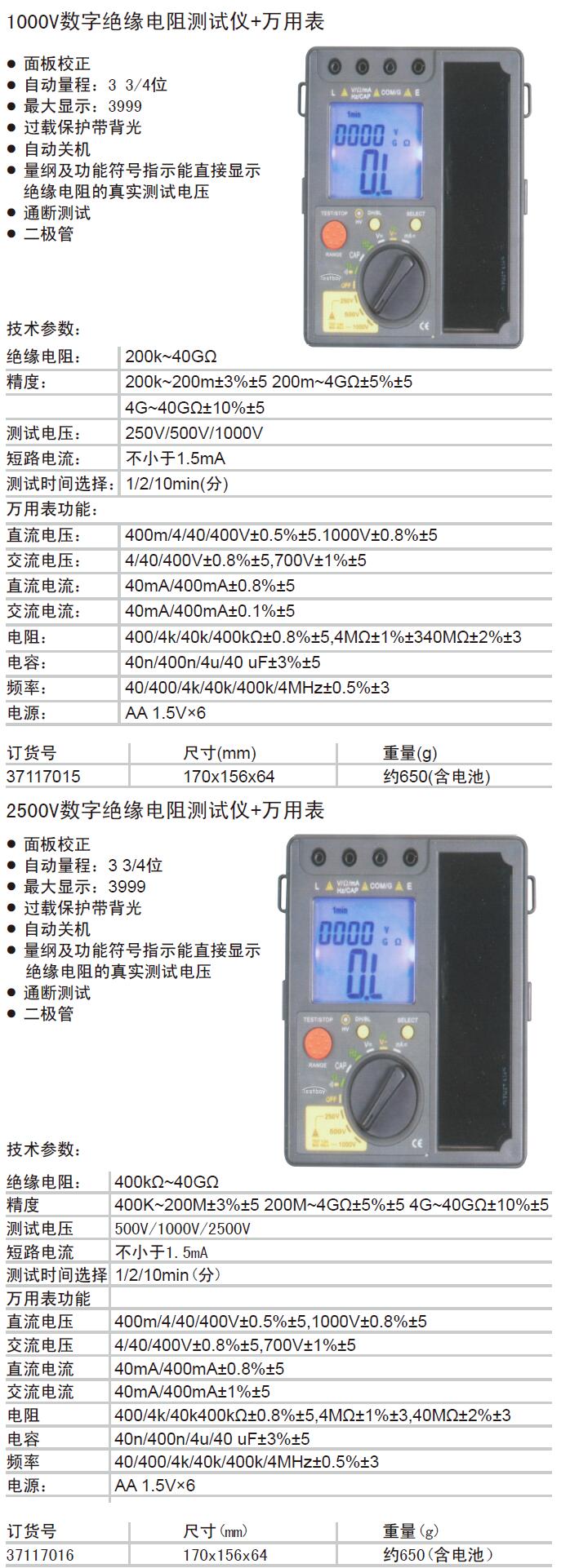 A51334 37117015 4/40/400V±0.8%±5,700V±1%±5 400m/4/40/400V±0.5%±5.1000V±0.8%±5 不小于1.5mA 40n/400n/4u/40 uF±3%±5 200k~40GΩ 200k~200m±3%±5 200m~4GΩ±5%±5 4G~40GΩ±10%±5 250V/500V/1000V 1/2/10min(分) 40mA/400mA±0.8%±5 40mA/400mA±0.1%±5 400/4k/40k/400kΩ±0.8%±5,4MΩ±1%±340MΩ±2%±3 40/400/4k/40k/400k/4MHz±0.5%±3 AA1.5V*6 170×156×64mm 约650g(含电池) 641.00