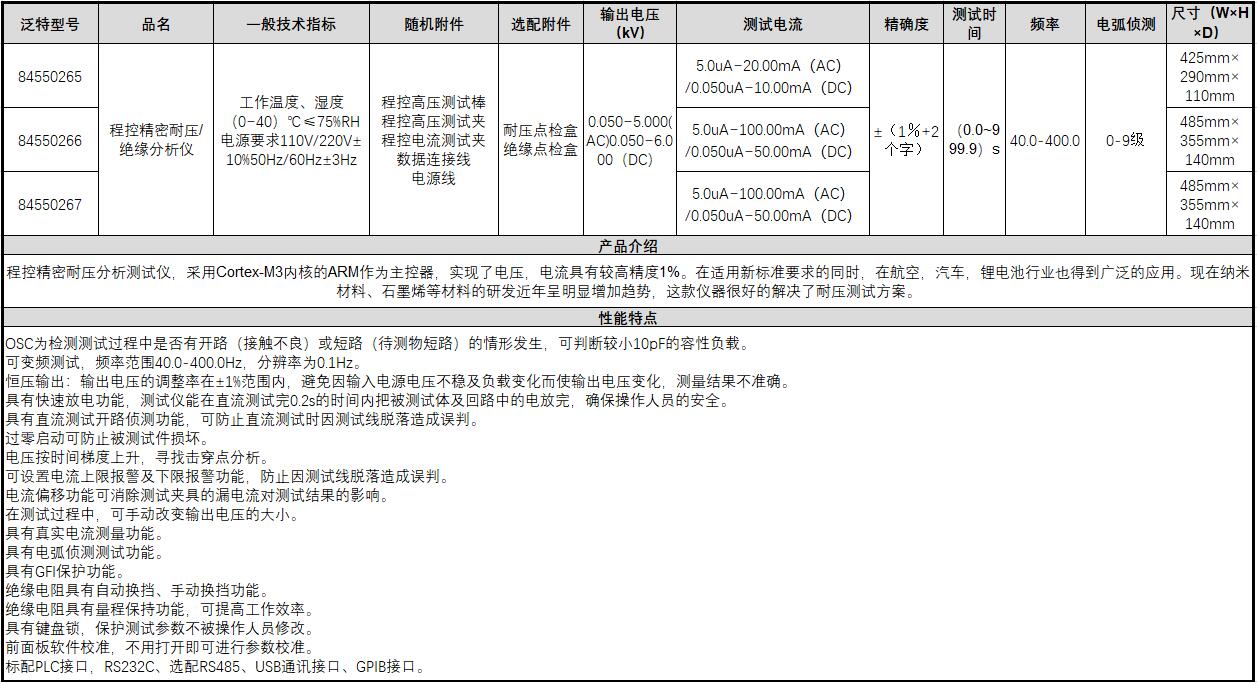 A31994 84550269 485mm×355mm×140mm 0.050~5.000(AC)0.050~6.000(DC)(kV) 5.0uA~100.00mA(AC)/0.050uA~50.00mA(DC) ±(1.5%+2个字) (0.0~999.9)s 40.0-400.0Hz 0-9级 84000.00