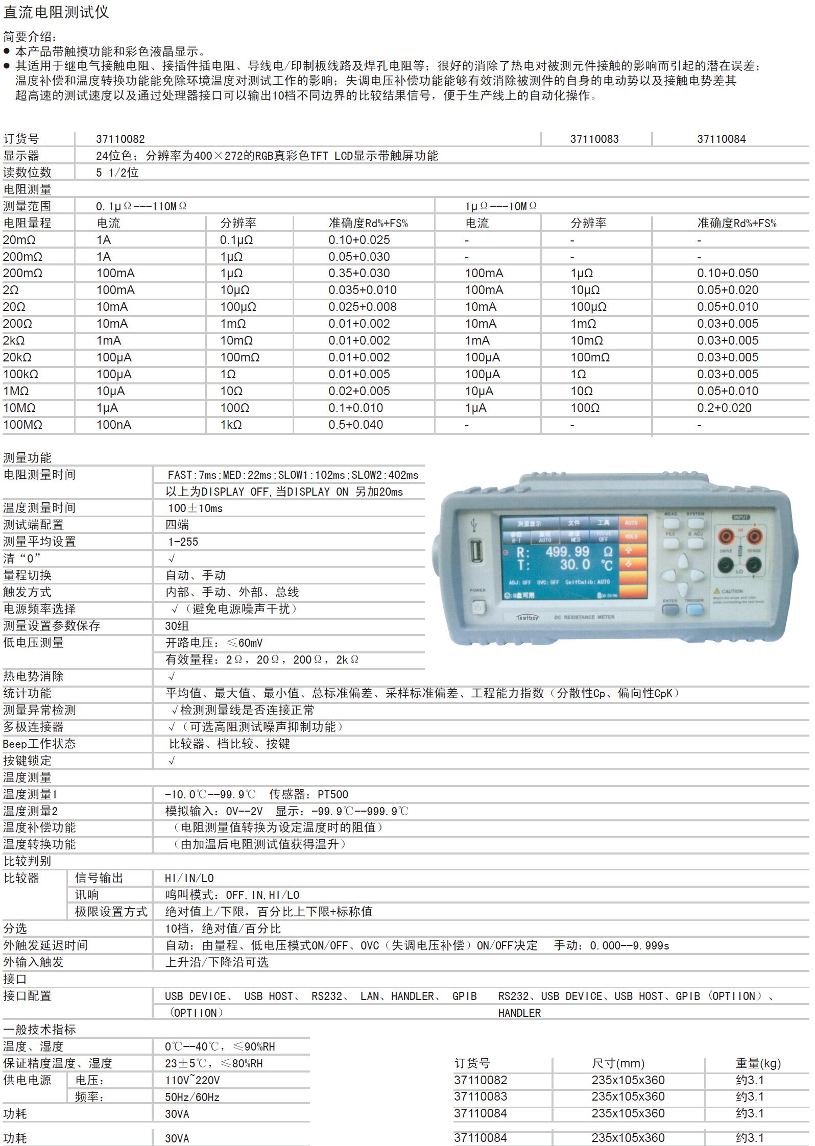A51932 37110083 1μΩ---10MΩ 约3.1kg —— —— 20mΩ 200mΩ 200mΩ 2Ω 20Ω 200Ω 2kΩ 20kΩ 100kΩ 1MΩ 10MΩ 100MΩ ‘- - 100mA 100mA 10mA 10mA 1mA 100μA 100μA 10μA 1μA - ’- - 1μΩ 10μΩ 100μΩ 1mΩ 10mΩ 100mΩ 1Ω 10Ω 100Ω - ‘- - 0.10+0.050 0.05+0.020 0.05+0.010 0.03+0.005 0.03+0.005 0.03+0.005 0.03+0.005 0.05+0.010 0.2+0.020 - FAST:7ms;MED:22ms;SLOW1:102ms;SLOW2:402ms 以上为DISPLAY OFF,当DISPLAY ON 另加20ms 100±10ms 四端 1-255 自动、手动 内部、手动、外部、总线 √(避免电源噪声干扰) 30组 开路电压:≤60mV 有效量程:2Ω,20Ω,200Ω,2kΩ 19305.00